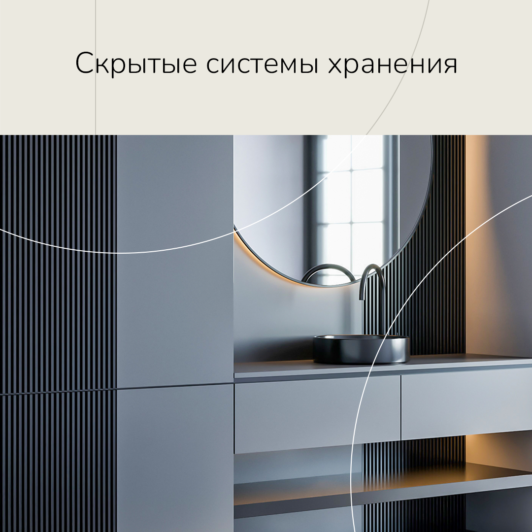 Одно из лучших решений для поддержания порядка и чистоты в помещении — скрытые системы хранения. Встроенные шкафы, ниши и выдвижные ящики в ванной помогают скрывать множество полезных мелочей и органично вписываются в дизайн и максимально незаметны, что особенно важно в помещениях, где каждый сантиметр на вес золота.