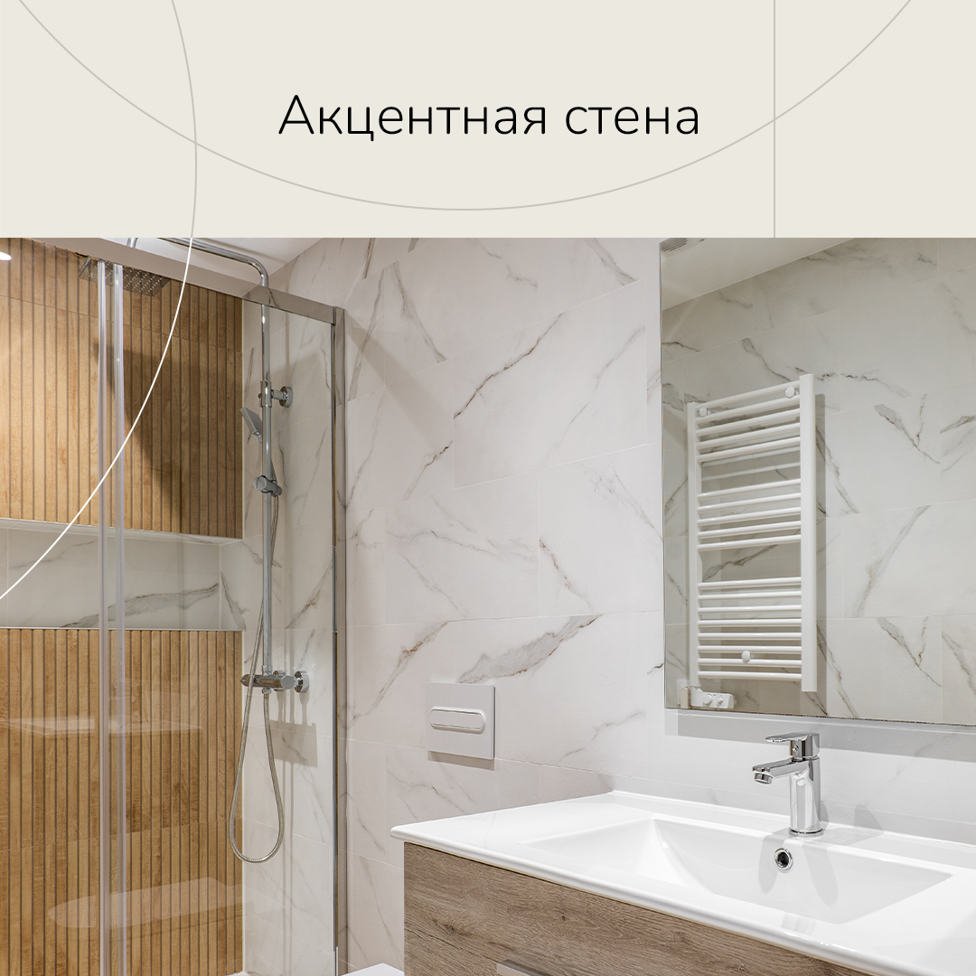 Акцентная стена — один из элементов дизайна ванной комнаты, с помощью которого можно придать помещению глубину и визуальный интерес. Для этого можно покрыть стену плиткой с уникальным узором, декоративной штукатуркой, деревом или вовсе выкрасить в яркий контрастный цвет.